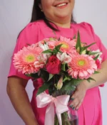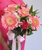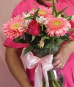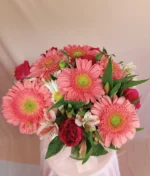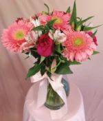 Jarrón con 6 rosas fiusha, 6 gerberas rosas y 6 varas de astromelia