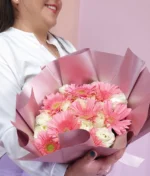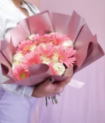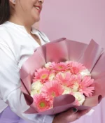Ramo de 24 rosas (blancas) y 8 gerberas rosas