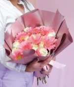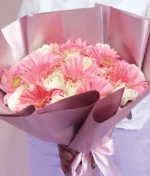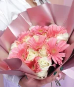 Ramo de 24 rosas (blancas) y 8 gerberas rosas