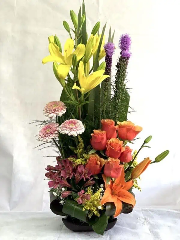 Hermoso arreglo tradicional con lilis, gerberas, rosas, alstroemerias y follaje