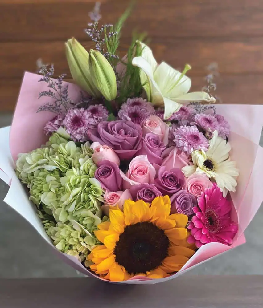 Bello ramo con rosas, lilis, girasoles, gerberas y hortensia